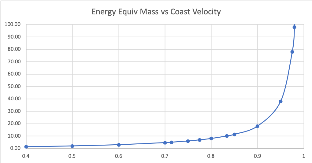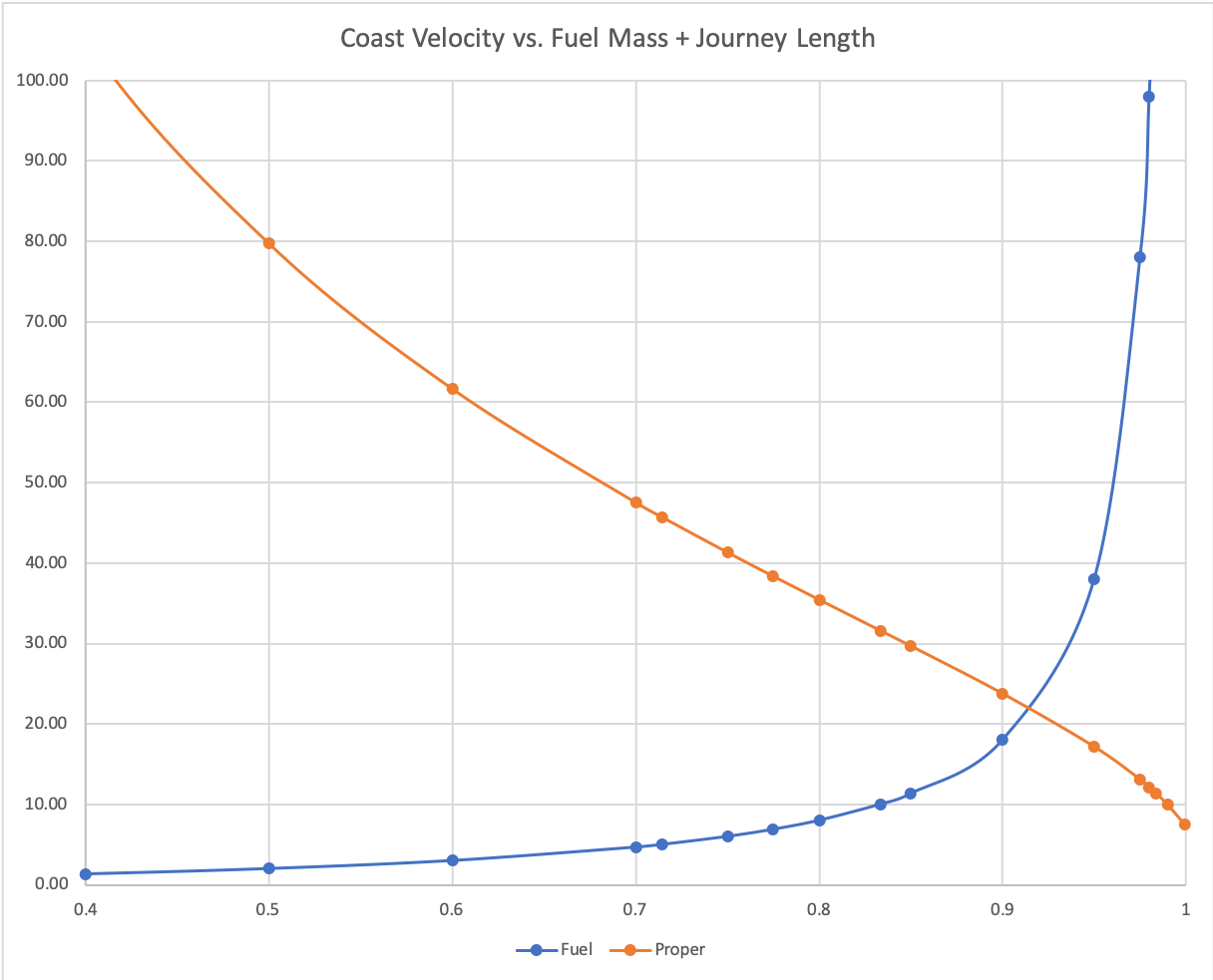 The blue line is fuel mass (in number of vessel masses), the orange line is travel time (in years, proper time). They cross pretty near that 0.9c mark.