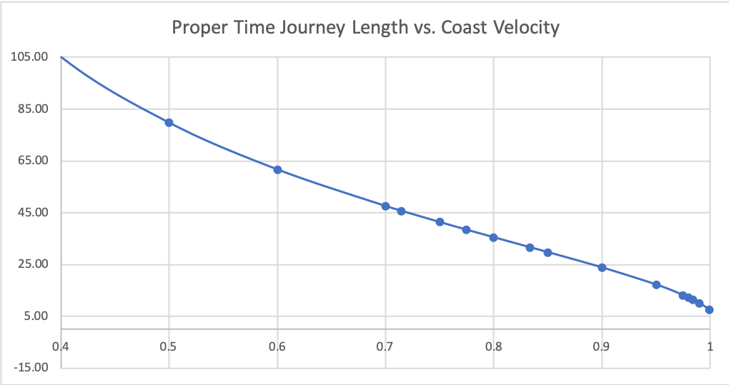 I uncovered several goofs in my original math. Travel time was fraction what my existing formulas were predicting. (7 years not 18 years, proper time.)