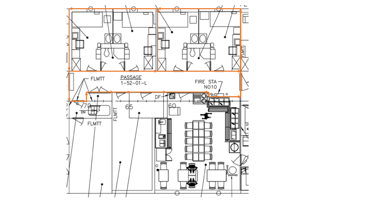 The next step is to start tracing the walls to capture what the model cares about as far as structural details. In this case, while the drawings show two cabins and a bathroom, for virtually every other aspect, these three spaces are one space for fire, flood, and damage control purposes: